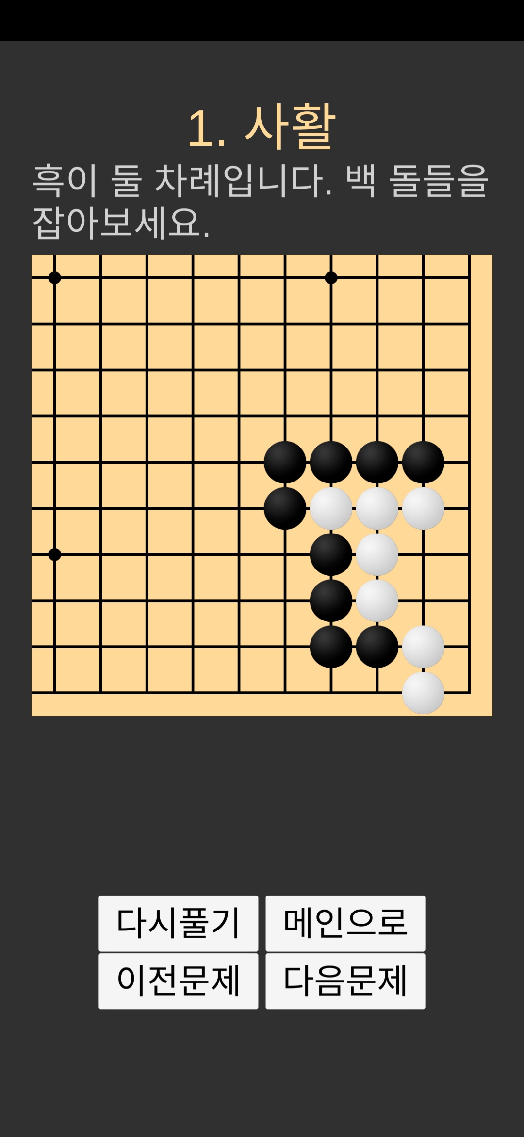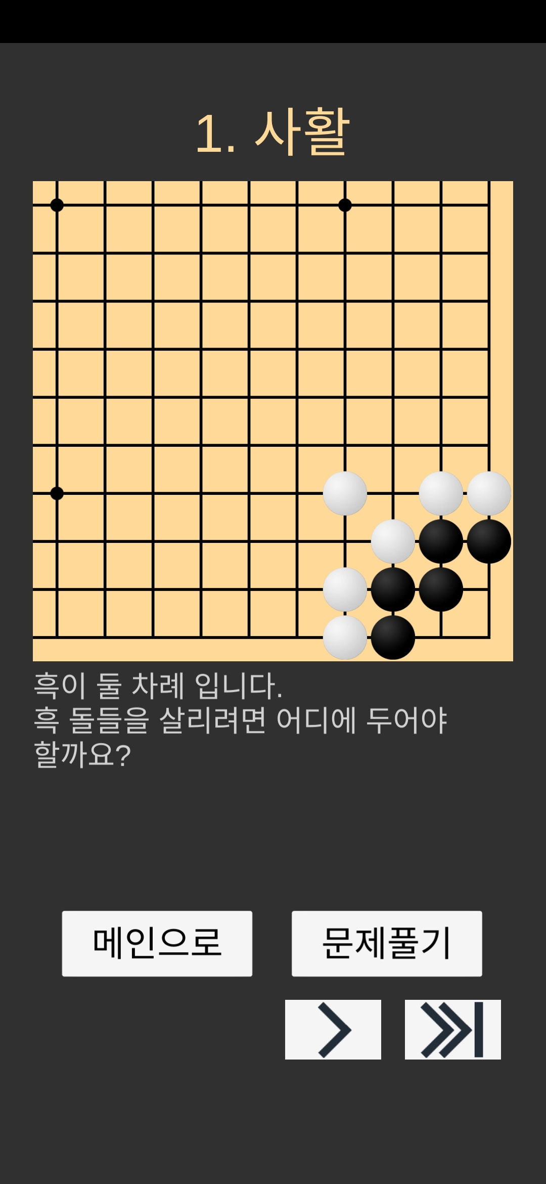 메인 화면에서 '1. 사활 버튼'을 누르고 들어가면 나오는 문제에 대한 설명 페이지가 나옵니다.