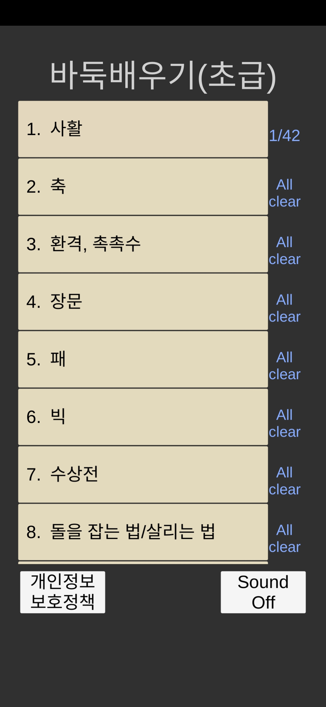 메인 화면은 예전 '바둑배우기' 앱과 같은 형식입니다.
